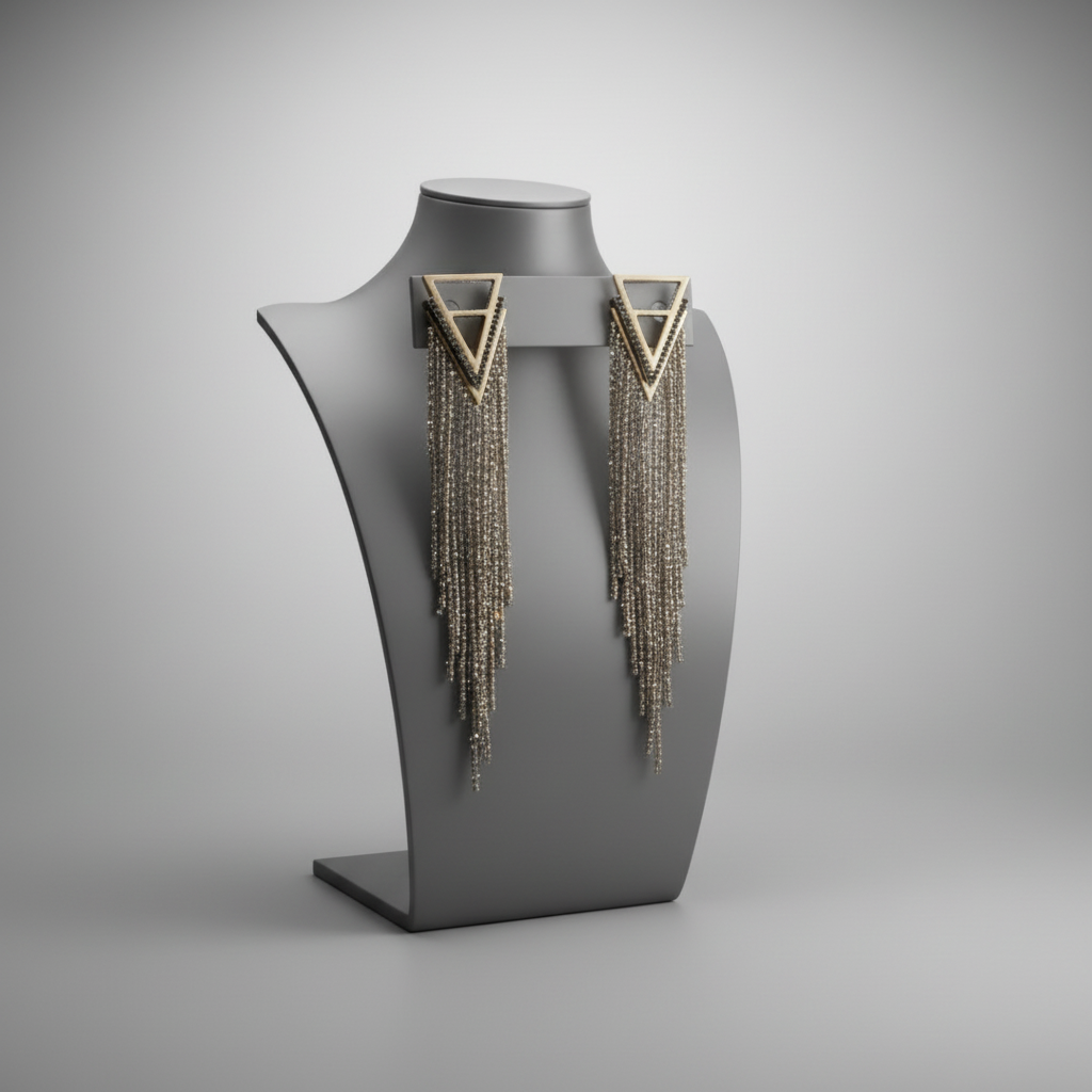 Two layers of silver triangles are topped with black rhinestones tapering down the V of the triangle.
