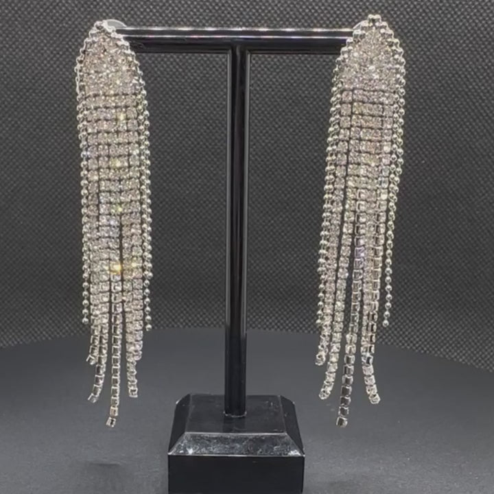 These elegant tassel earrings are unusual with beaded edges and a pointed dome top along with clear rhinestone tassels.