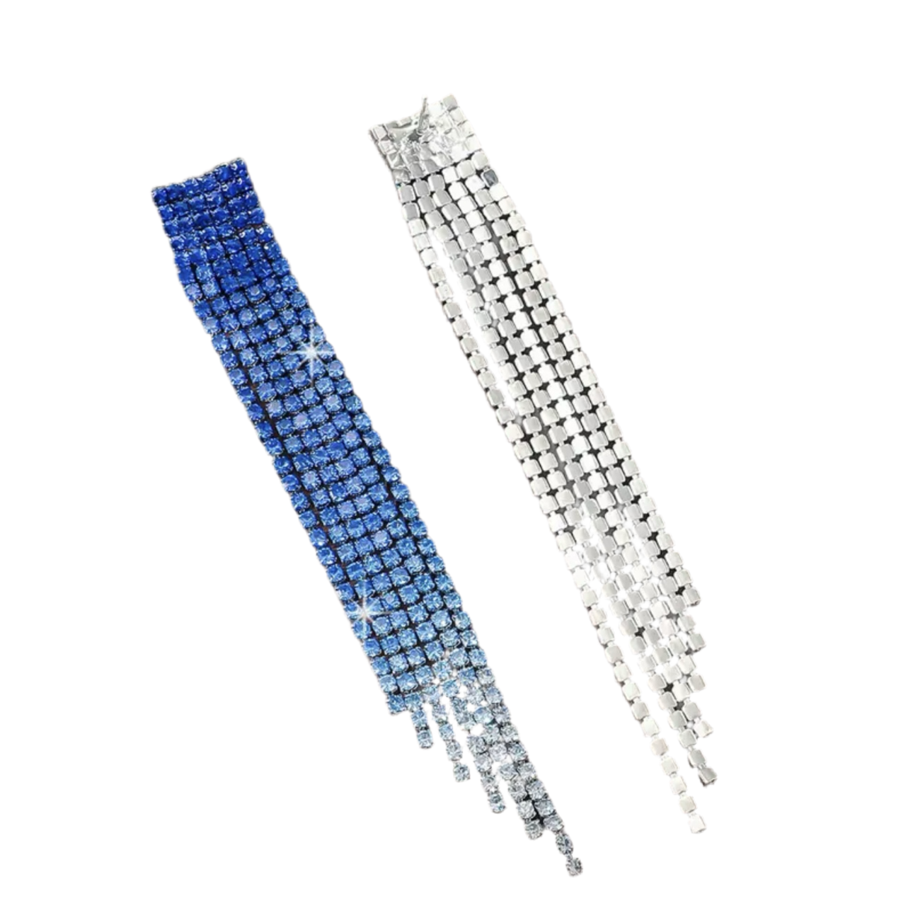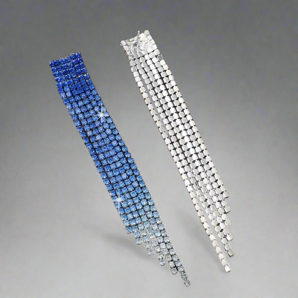 Gradient tassel earrings begin with royal blue, transform into light blue and then clear stones. Gradient styles are great for color matching.