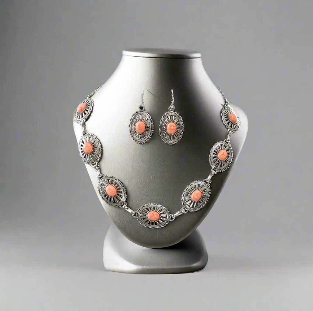 Blue turquoise and silver tone necklace and earrings set provides a modern take on a vintage, classic western style.