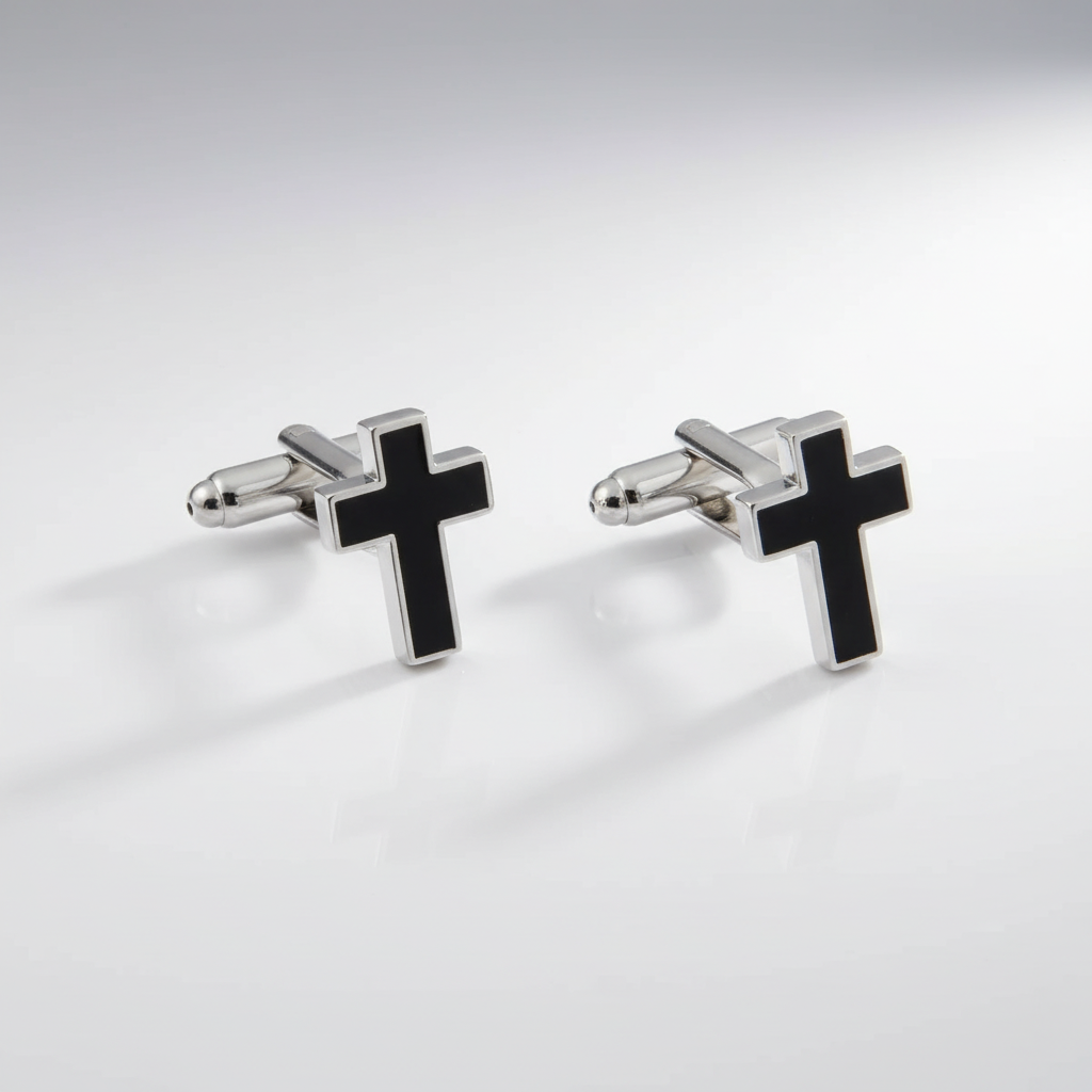 Black cross cufflinks in silver tone.