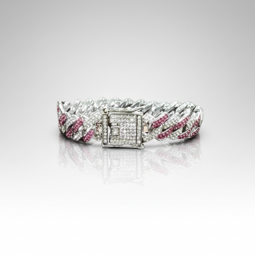 This Cuban chain set features alternating pink and clear rhinestones in a silver tone setting.