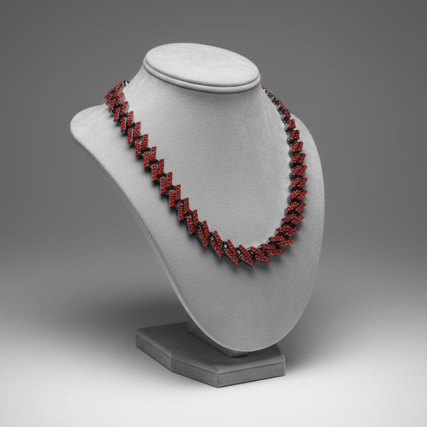 Colorful red diamond-cut zircon stones really pop against the black setting.