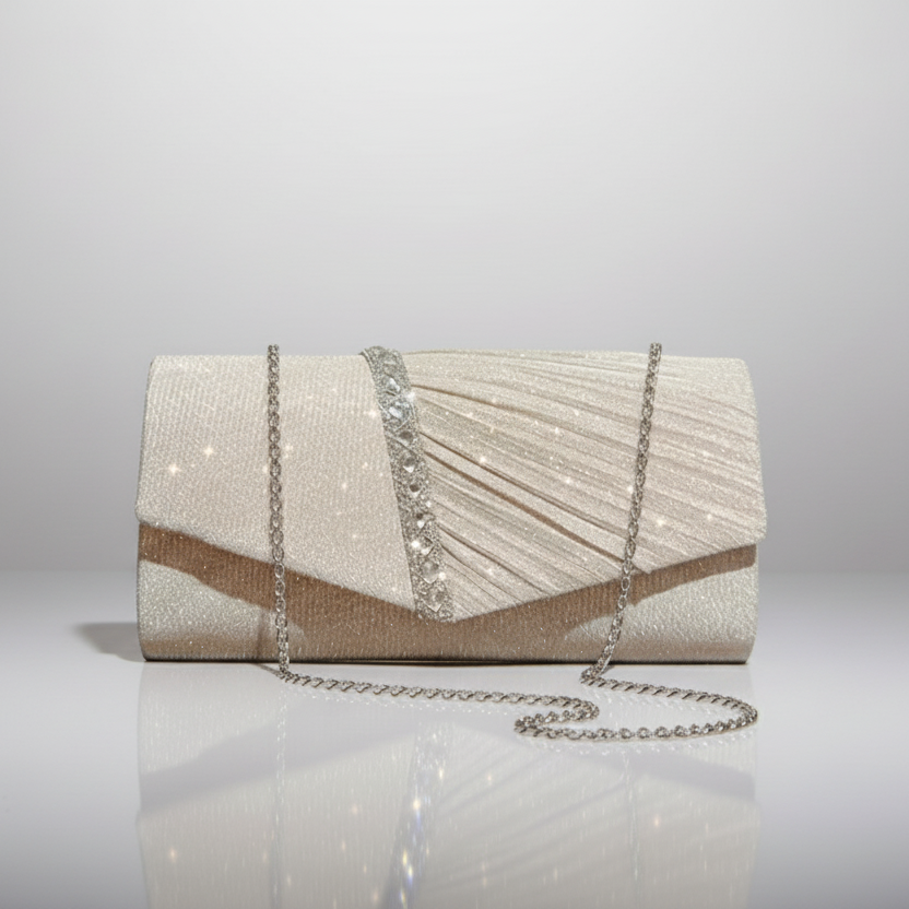 Classic clutch evening bag covered in light gold glittery fabric with rhinestones embellishments is a style everyone should have in their closet.