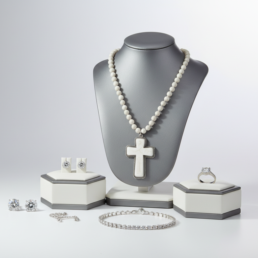 Genuine white turquoise beaded necklace with a gorgeous antique silver tone cross.