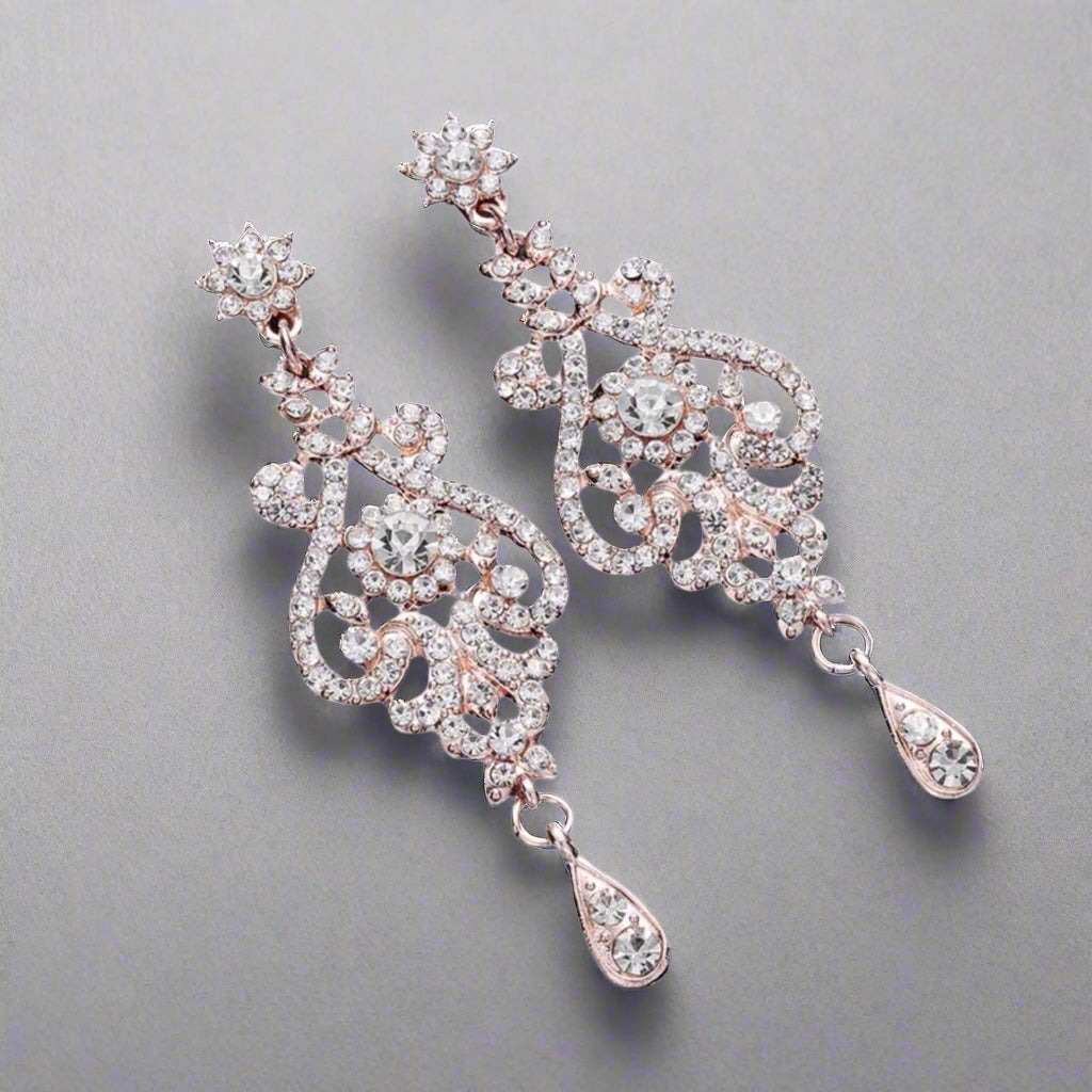 Clear glass rhinestones and rose gold tone. Lobster claw clasp.