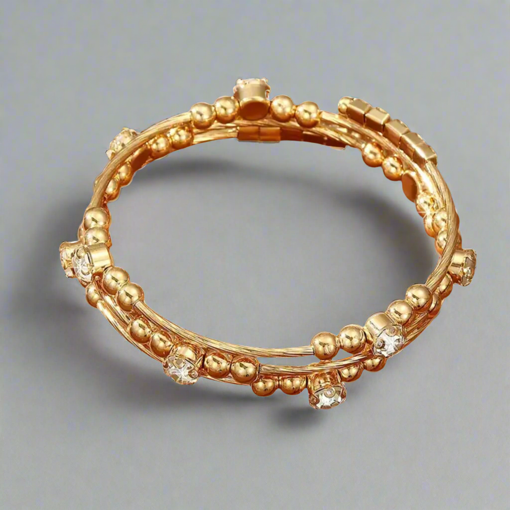 Yellow gold tone beads and rhinestones decorate this textured bracelet.