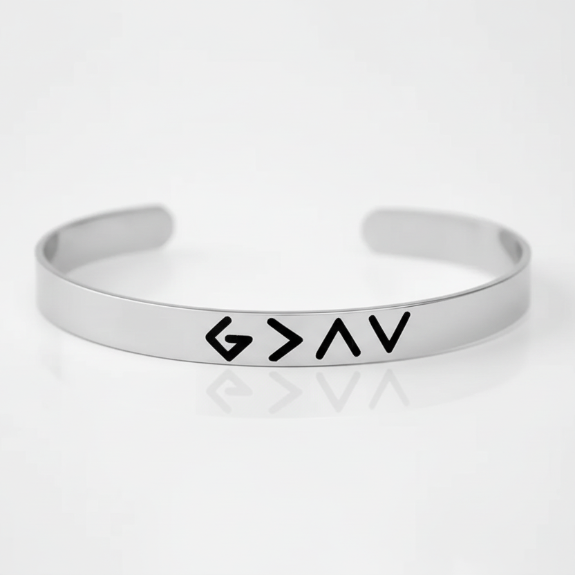 Stainless steel cuff bracelet with black printed on the exterior symbolizing the phrase: