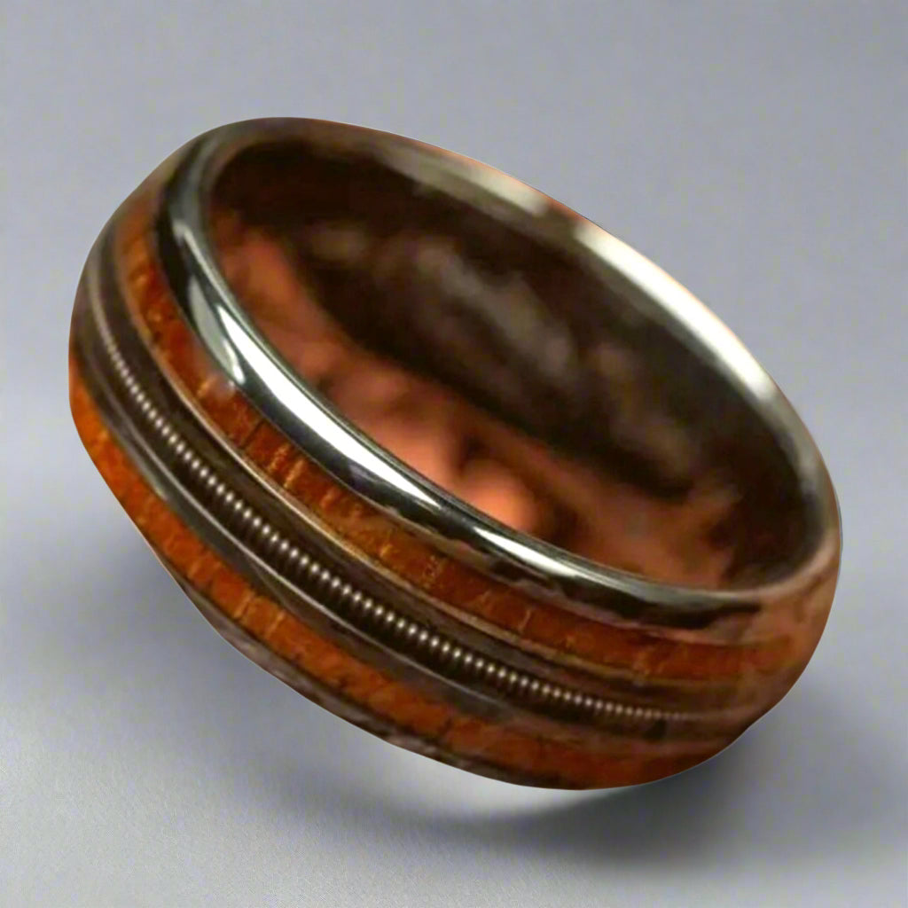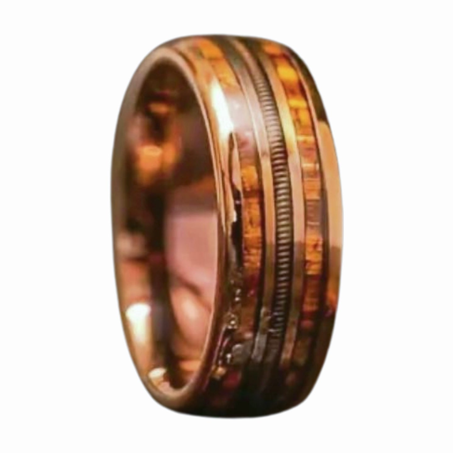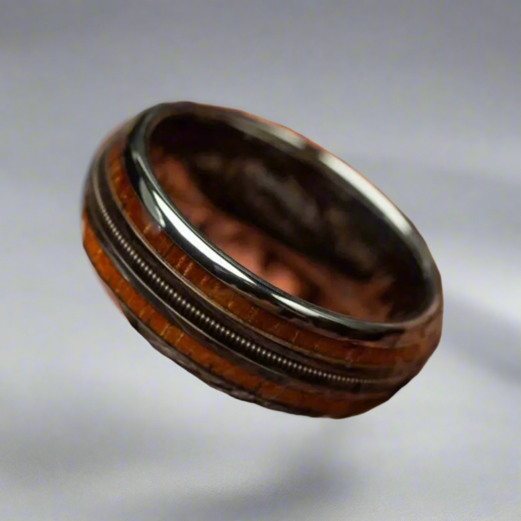 This elegant ring has a guitar string embedded in the center of beautiful wood grain. Band is finished in gun metal black or rose gold tone.
