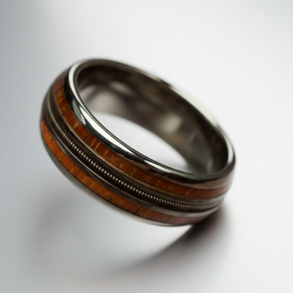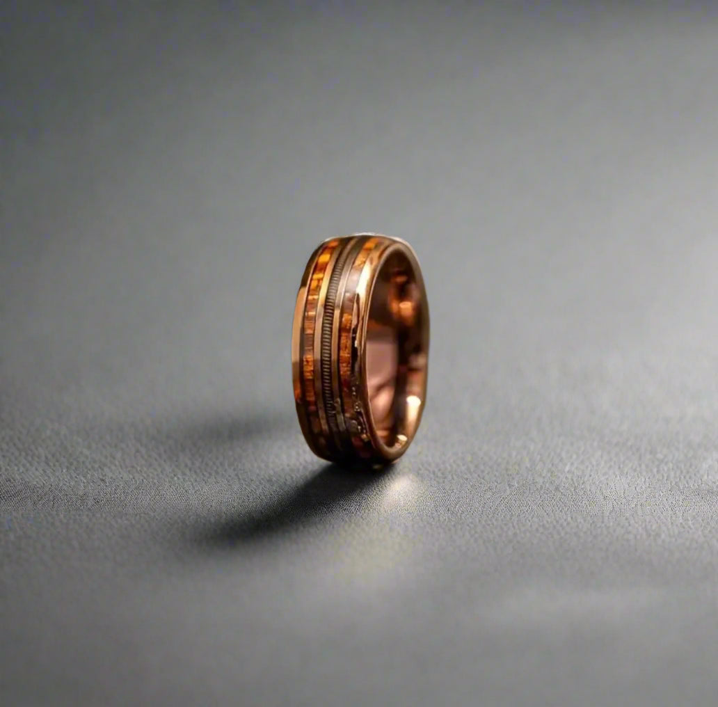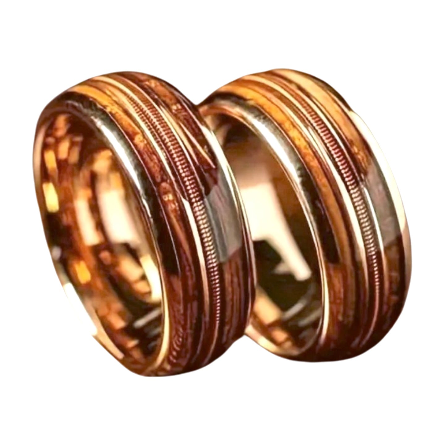 This elegant ring has a guitar string embedded in the center of beautiful wood grain. Band is finished in gun metal black or rose gold tone.