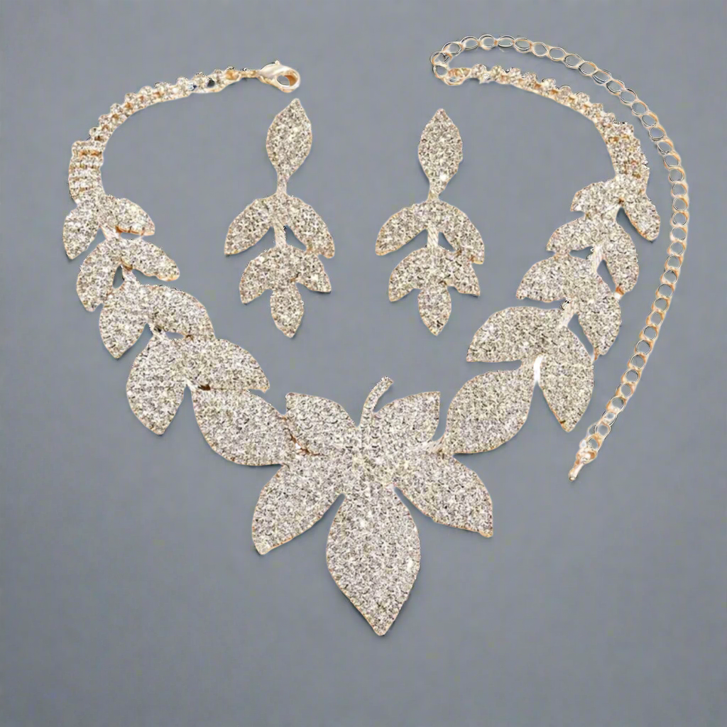 This gorgeous leaf theme jewelry set is a huge staff favorite. The clear rhinestone leaves are quite contemporary and are beautiful on.