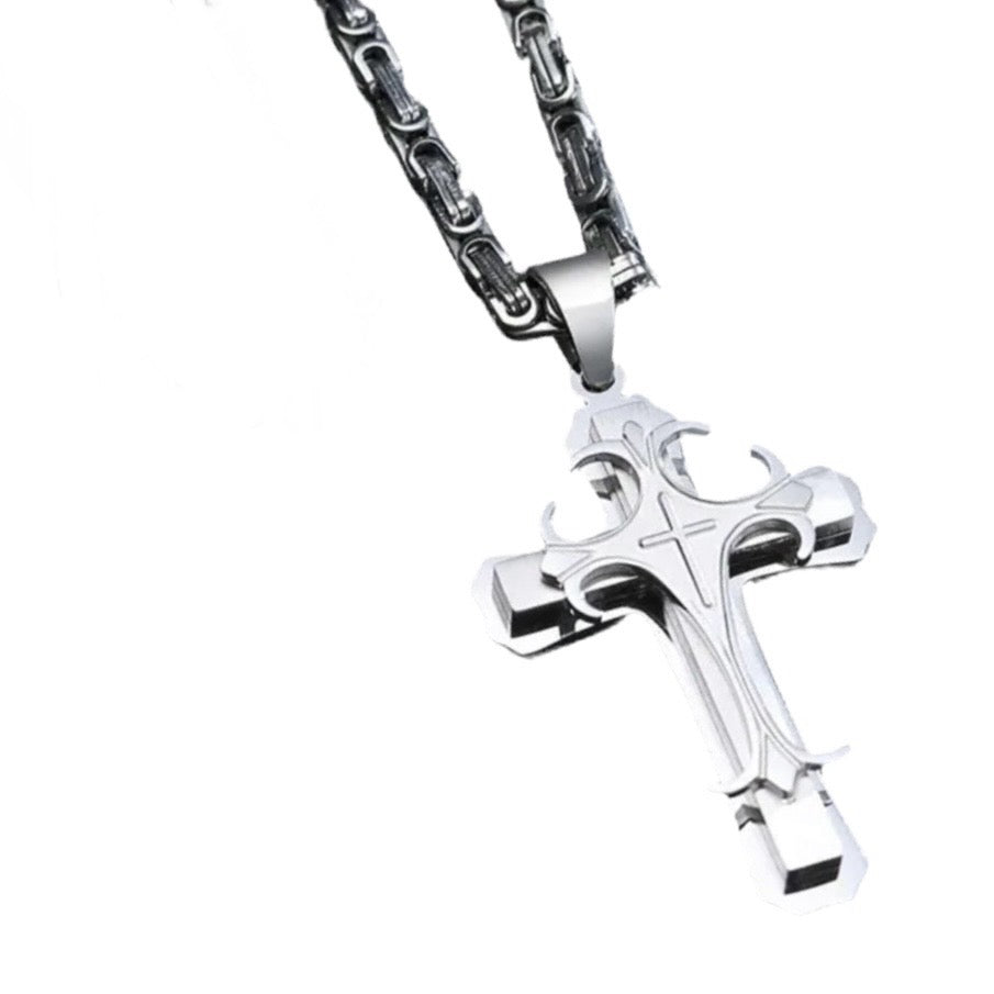 Stainless steel double-layered cross pendant in silver on a Byzantine chain necklace.