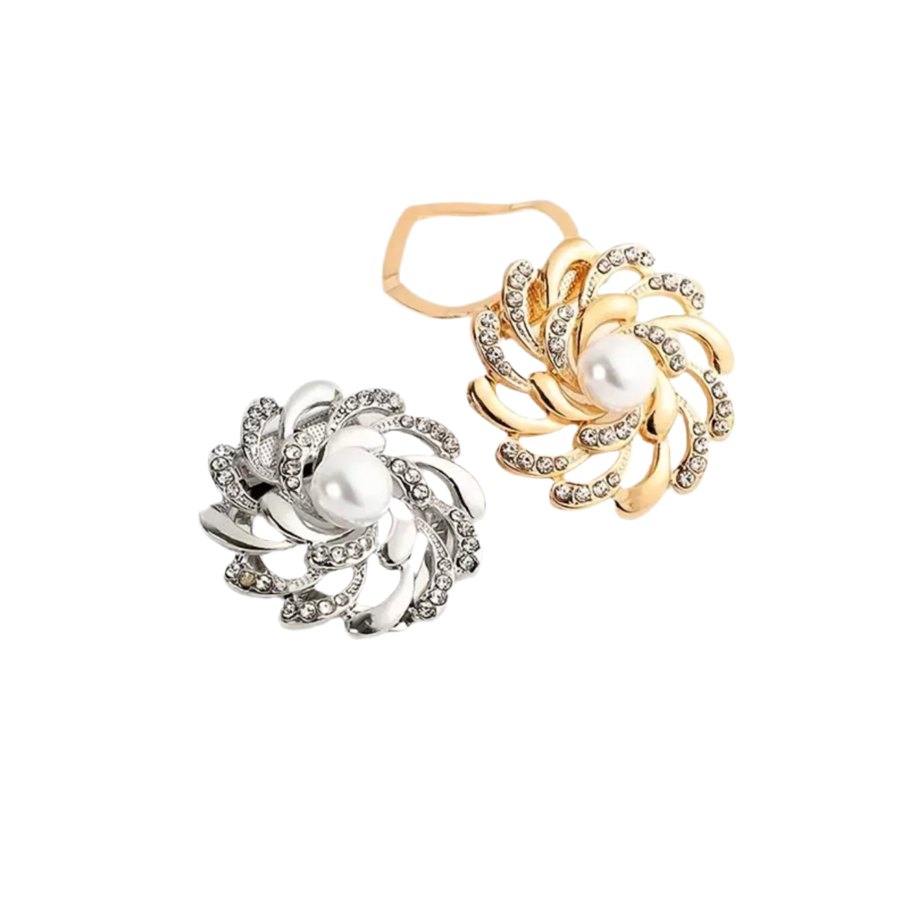 Large faux pearl surrounded by clear rhinestones in your choice of silver tone or gold tone.