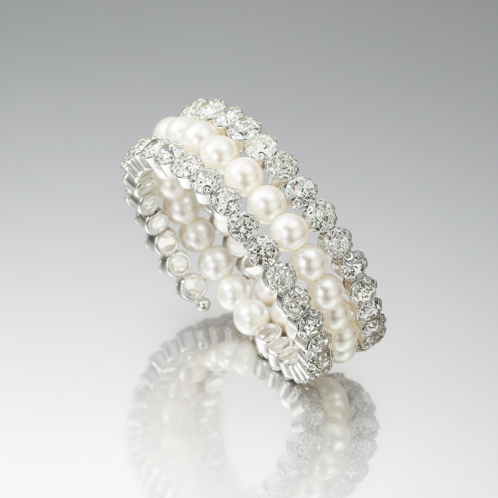 Sophisticated, beautiful style with a row of faux pearls surrounded by sparkling rhinestones.
