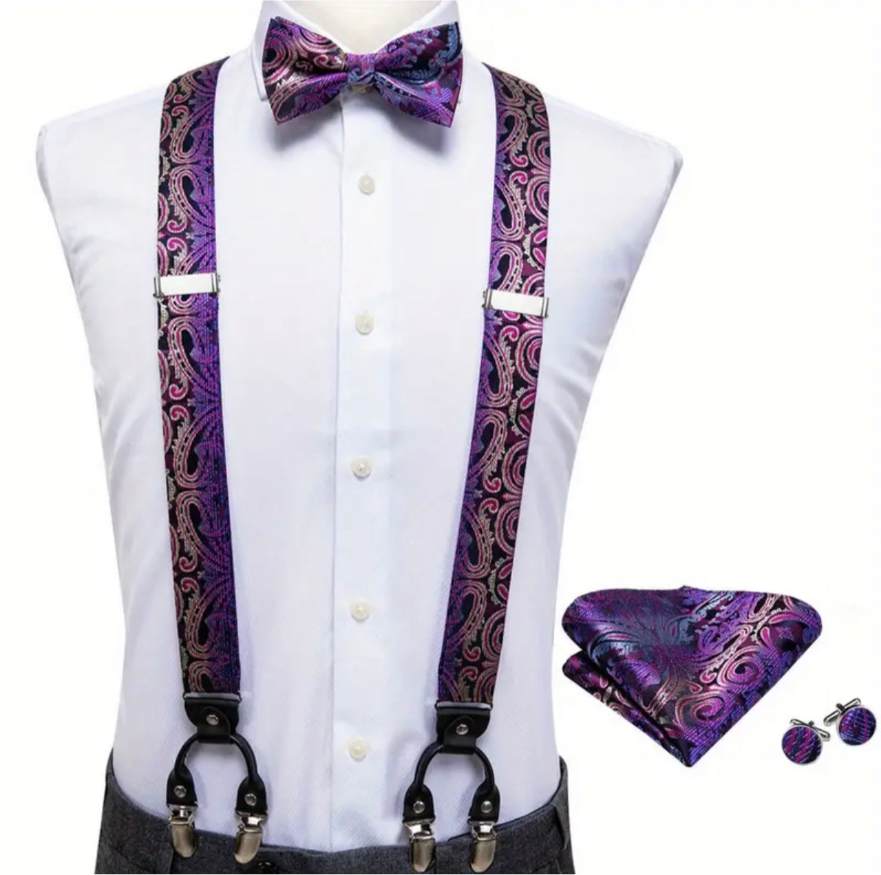This set comes with bow tie, suspenders, cufflinks and pocket square.