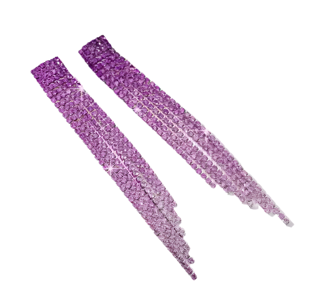 Gradient tassel earrings begin with purple, transform into lavender and then clear rhinestones. Gradient styles are great for color matching.