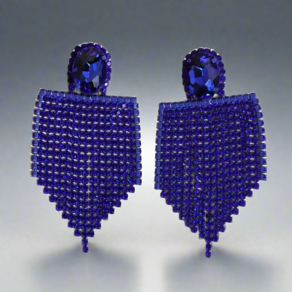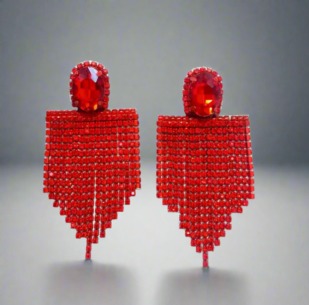 Earrings feature an oval rhinestone on top with V-shape fringe below.
